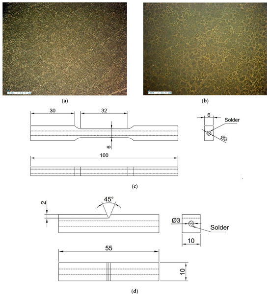 (a) 60Pb40Sn solder, (b) 99.3Sn0.7Cu solder, (c) Tensile specimen drawing filled with solder, (d) Impact specimen drawing filled with solder.