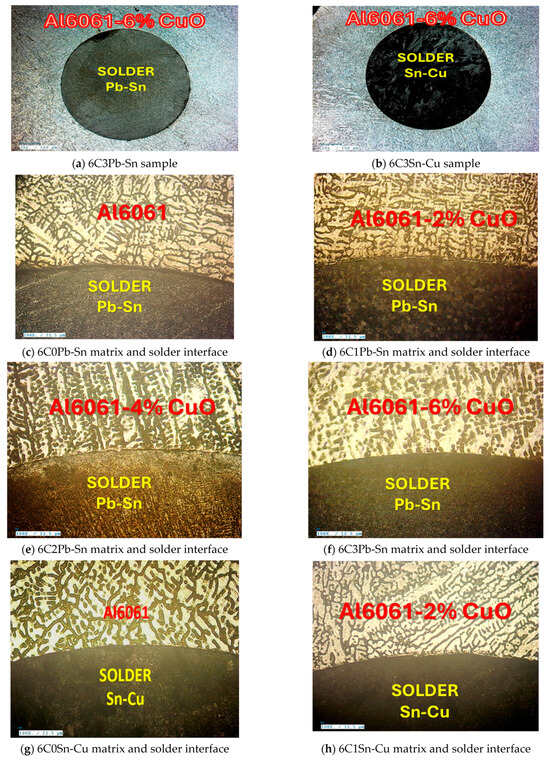 This study chose Al alloy 6061 (Al6061) as the base alloy material due to its outstanding mechanical properties, corrosion resistance, widespread use in structural and electronic applications, and CuO as the primary reinforcing material. To evaluate the impact of different soldering materials on Al6061-CuO, two distinct solder alloys, 60Pb40Sn and 99.3Sn0.7Cu, were utilized. These solders were chosen based on their compatibility with Al, mechanical strength, and thermal performance. The comparative analysis of Al6061-CuO + Pb-Sn and Al6061-CuO + Sn-Cu aims to determine the most suitable solder for optimizing joint reliability, mechanical integrity, and microstructural stability in Al-MMCs’ applications.