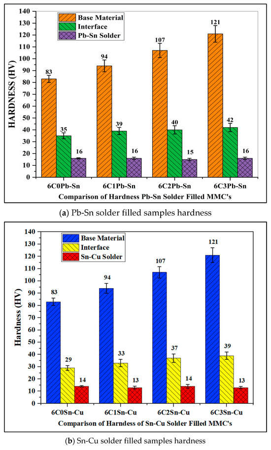 The hardness is tested on the samples along the diameter of the cross-section to measure hardness on the base material, interface and solder. The hardness of the interface is observed to be greater than that of the solder. Figure 4 represents the hardness of the sample due to the reinforcement. The hardness of the MMCs increased with the increase in CuO filler content, which is the highest at 6 wt.%. It is observed that hardness is higher for composites than interface and lowest for solder. The hardness at the interface of Pb-Sn solder-filled composites is higher than that of Sn-Cu solder-filled composites.