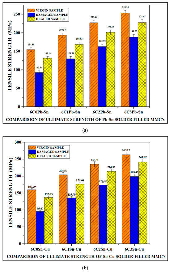 The UTS for Pb-Sn reinforced samples for base alloy (6C0Pb-Sn) for the virgin test specimen is 154.90 MPa as compared to that of the self-healed sample is 131.14 MPa, the UTS for 6 wt.% of CuO (6C3Pb-Sn) reinforced virgin sample is 253.35 MPa and healed samples is 228.064 MPa the results are presented in the graph in Figure 7a. Whereas UTS for Sn-Cu reinforced samples with base alloy (6C0Sn-Cu) for the virgin test specimen is 160.28 MPa as compared to that of the self-healed sample is 137.70 MPa, the UTS for 6 wt.% of CuO (6C3Sn-Cu) reinforced virgin sample is 263.17 MPa and healed samples is 241.62 MPa the Figure 7b, is presented with the results. The standard deviation for UTS strength of Pb-Sn and Sn-Cu filled Al6061-CuO MMCs Sn-Cu solder was ±6.72 MPa.