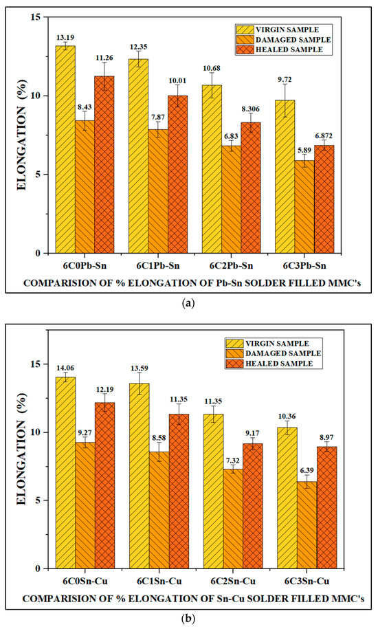 It is observed from Figure 8a that for Pb-Sn reinforced samples for base alloy (6C0Pb-Sn), the virgin sample has a strain of about 13.19% as compared to 11.26% that of the self-healed sample, the percentage elongation for 6 wt.% of CuO reinforced (6C3Sn-Cu) virgin sample and healed samples are 9.72% and 6.87% respectively. The standard deviation for percentage elongation of Pb-Sn solder was ±0.53%. However, for Sn-Cu reinforced samples for base alloy (6C0Sn-Cu), the virgin sample has a strain of 14.06%. In comparison, for 12.19% of the self-healed sample, the percentage elongation for 6 wt.% of CuO reinforced (6C3Sn-Cu) virgin sample and healed samples are 10.36% and 8.97%, respectively. The above graph and data show that the Sn-Cu solder will give less percentage elongation than the Pb-Sn solder. The standard deviation for percentage elongation of Pb-Sn solder was ±0.55%. The results are presented in the graph in Figure 8a,b.