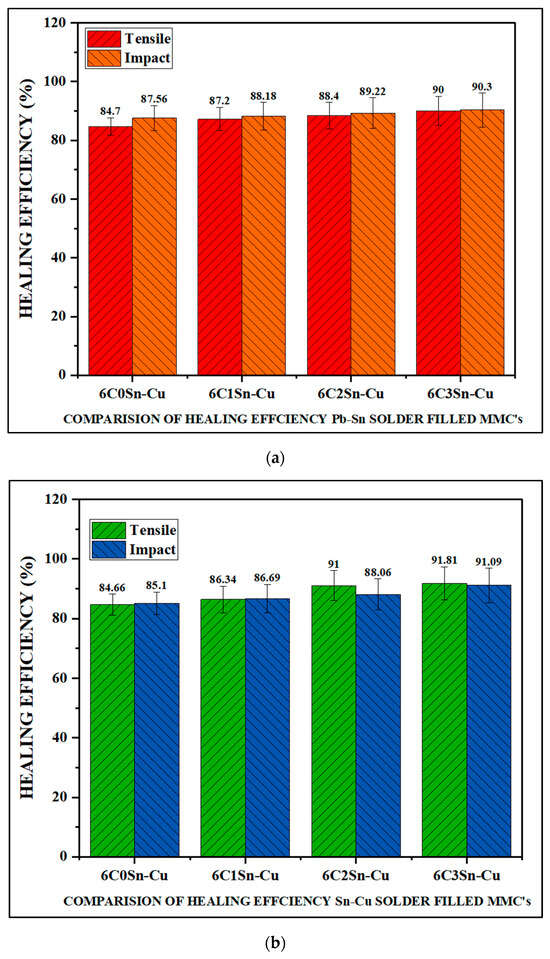 Healing Efficiencies of tensile and impact samples. (a) comparison of Pb-Sn filled Al6061-CuO MMCs and (b) comparison of Sn-Cu filled Al6061-CuO MMCs.