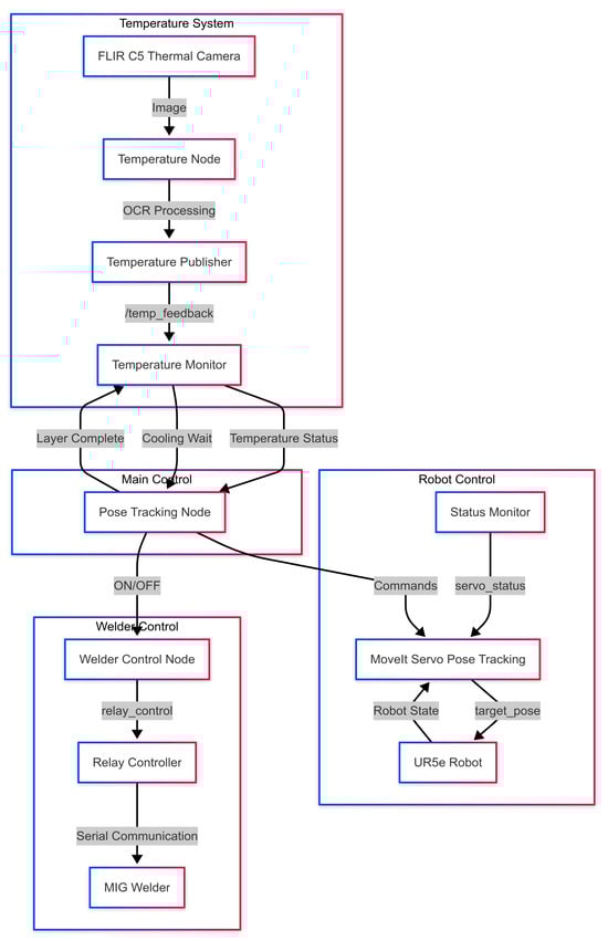 The experimental apparatus comprises integration of a UR5e robotic manipulator (Universal Robots, Odense, Denmark) with a Vulcan MIGMAX 215 MIG welding system (Harbor freight, Calabasas, CA, USA) for W-DED, as illustrated in Figure 1. The system architecture encompasses three primary subsystems: a temperature monitoring system utilizing a FLIR C5 thermal camera (FLIR Systems, Wilsonville, OR, USA) with Optical Character Recognition(OCR)-based temperature extraction, a welder control system managing the MIG power supply through relay-based serial communication, and a robot control system implementing MoveIt Servo (version:2.5.4-1) [24] for precise motion control. These subsystems are orchestrated through a central pose tracking node that coordinates layer completion, thermal management, and deposition processes. Robot Operating System 2 (ROS2) (version: Humble Hawksbill) [25]-based implementation facilitates inter-node communication through well-defined topics, ensuring robust data flow between system components.