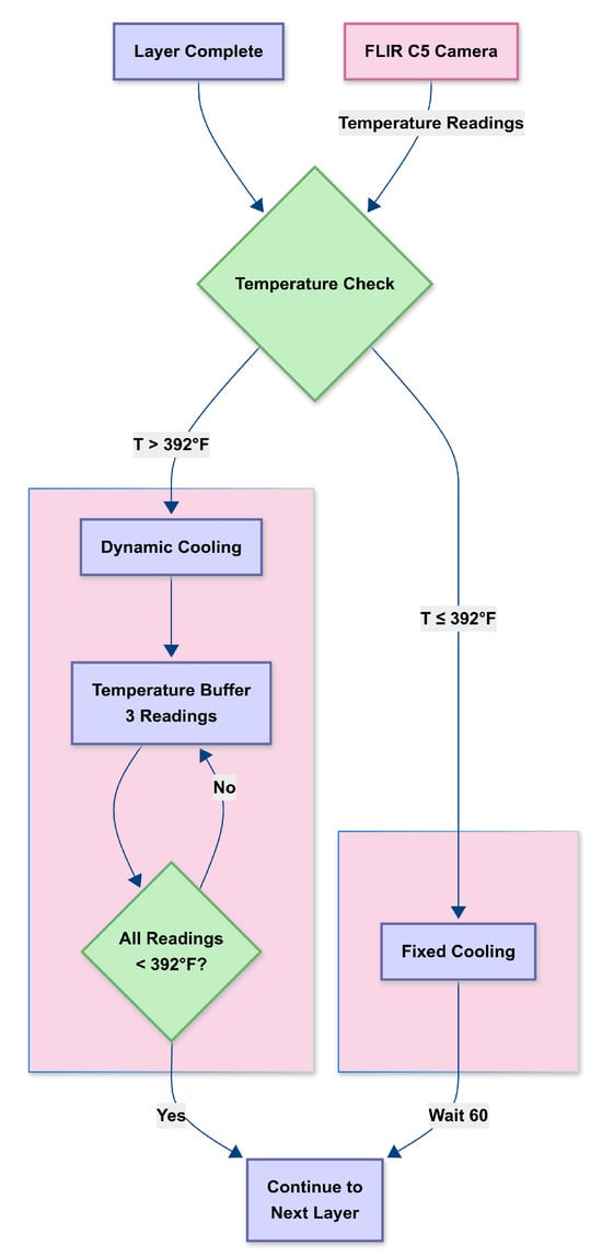 Critical to the system’s effectiveness is its hysteresis-based stability verification mechanism. The controller requires three consecutive temperature readings below the threshold before proceeding with the next deposition layer. This approach prevents premature layer initiation while ensuring adequate thermal conditions for optimal process control.