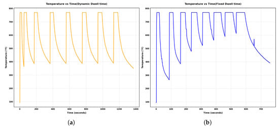 Figure 9 presents the temperature profile and mode switching, demonstrating that the controller effectively executed mode transitions between fixed dwell time and dynamic dwell time regimes based on the predetermined thermal threshold criteria.