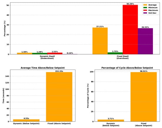 The effectiveness of the dynamic dwell time control system is further validated through detailed statistical analysis of the thermal behavior. The comparison of temperature control performance reveal remarkable improvements in temperature control precision. The dynamic system demonstrates exceptional control with an average undershoot of merely 1.38%, contrasting sharply with the fixed system’s substantial average overshoot of 27.21%. This precision is further emphasized by the dynamic system’s minimal variation, with undershoot values ranging from 1.28% (minimum) to 1.53% (maximum), resulting in a remarkably low standard deviation of 0.14%.
