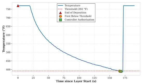 Layer 3 thermal profile showing controlled cooling from deposition temperature to threshold (392 °F) with precise controller authorization (green marker) at the appropriate threshold crossing point.