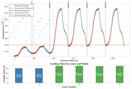 The temporal aspects of temperature control shown in Figure 7 illustrate the potential advantages of the dynamic approach. On average, the dynamic control strategy keeps the temperature below the setpoint for only 6.55 s per cycle, or about 3.71% of its total cycle time. These values were calculated by examining each cooling cycle from the point of peak temperature until the setpoint was reached again, and then determining how long the temperature profile remained below 200 °C within that interval. In contrast, in the fixed dwell time strategy, the temperature remains above the setpoint for an average of 152.33 s—about 98.91% of its cycle time. This number was determined by measuring the cumulative duration during which the recorded temperature exceeded 200 °C for each cycle, again normalized by the total cycle length specific to that strategy. Although the two processes have different overall durations, this substantial difference in time spent outside the target temperature window points to the efficacy of the dynamic system and suggests that it may support better part quality. It is important to note that this 3.71% figure includes the interval required for confirming three consecutive temperature readings below the threshold, ensuring that the temperature remains stably below 392 °F before initiating the next deposition cycle.