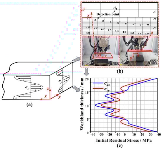 Determination of workblank initial residual stress field: (a) distribution characteristics of the initial residual stress field; (b) measurement of the residual stress at characteristic points; (c) distribution curve of the workblank initial residual stress field.