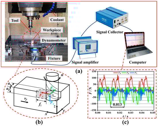 Milling force test and results: (a) milling force test setup; (b) schematic diagram of end milling; (c) milling force experimental results.