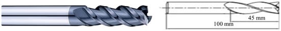 As shown in Figure 3, the experiment of end milling was carried out on the JT-VL850B vertical machining center. After screening the machining parameters by orthogonal tests, the milling parameters were determined, as listed in Table 3. The tool and milling parameters were the same as those for the machining of frame-type thin-walled parts. The tool was a Φ10 mm three-flute carbide end mill; its structural parameters are listed in Figure 4 and Table 4. During the machining, a 5% emulsion was applied as cooling fluid, and the milling force was measured by using a Kistler 9272 cutting dynamometer. As can be seen in Figure 3, the workpiece is subjected to three-dimensional forces from the tool during the milling, in which the feed force Fx is the largest, the normal force Fy is the second largest, and the axial force Fz is the smallest. With the rotation of the tool, the workpiece material was removed continuously in wedge-shaped units, so that Fx, Fy, and Fz all show the trend of cyclic fluctuations [27].