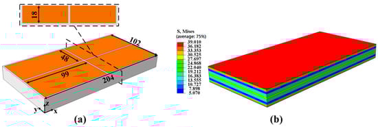 The workblank 3D model is shown in Figure 6. This model was built according to the actual dimensions of the workblank, where the x-axis, y-axis and z-axis represent the length direction, the width direction, and the thickness direction, respectively. The rib and base thickness of the frame-type parts were set to 2 mm. Since the dimension of the workblank was 204 mm × 102 mm × 20 mm, the removal material size of a single frame should be 99 mm × 48 mm × 18 mm. The material properties of the workblank model are defined according to the material parameters listed in Table 1 and Table 2. The model is meshed by the manually controlled mapping method, which generates 416,160 elements, and the mesh type is the C3D8R element. Subsequently, the initial stress field obtained in the part of 2.1 was scattered and loaded to the corresponding layers of the workblank model by the SIGINI subroutine.