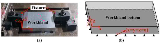 As shown in Figure 7, the constraint for the workblank model was set according to the actual clamping mode. During actual machining, the workblank was positioned by its bottom and clamped on the workbench of the machining center. Therefore, the constraint for the workblank model was set to a completely fixed mode at the bottom. After the simulation was finished, the constraint was transformed into a three-node constraint (XYZ–YZ–Z) mode with non-collinear bottom surface. This method not only takes into account the constraint during actual machining, but allows the workpiece to deform freely after unloading.