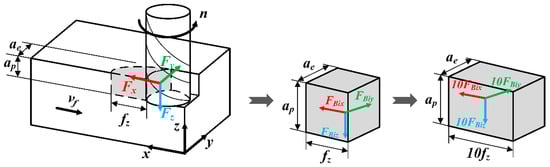 where FBi is the body force (N/mm3), F is the experimental milling force (N), and V is the volume of the removal unit in the actual milling (mm3). According to Equation (1), the three-dimensional maximum milling forces obtained in the part of 2.2 were equivalently converted into three-dimensional body forces: FBix = 32.78 N/mm3, FBiy = −28.89 N/mm3, and FBiz = −19.44 N/mm3.