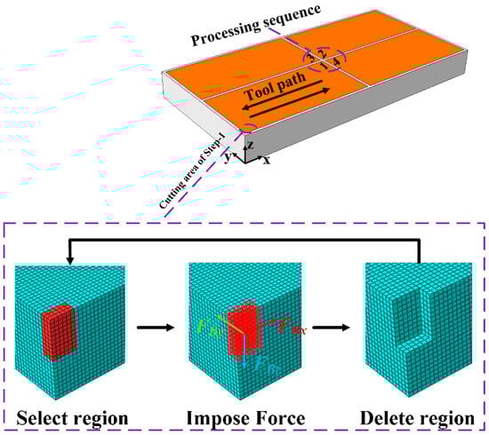 In order to simplify the calculation, the removal unit shape of the actual end milling needs to be simplified. The simplification of the cutting layer is generally based on two principles: firstly, the simplified area should facilitate the realization of the material removal and the application of loads; secondly, it should significantly improve the computational efficiency. As shown in Figure 8, the wedge-shaped removal unit was simplified to a rectangular unit of the same size, which is not only convenient for meshing, but is conducive to loading the milling force [28]. During the simulation, the material removal length in each analysis step was defined as 10 fz; that is, each simulation analysis step was 10 times the feed per tooth of fz in the actual milling. As a result, the three-dimensional milling forces applied to each analysis step were also scaled up in equal proportion. Figure 9 shows the schematic diagram of removal of the machined material by the element deletion method. The material removal in each analysis step was realized by three steps, including selecting the region, applying the force load, and deleting the region. Then, the analysis steps were set according to the tool path and the frame processing sequence to achieve the complete removal of machining allowance.