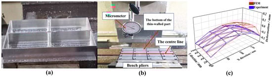 In order to verify the simulation method, a milling test for the four-frame thin-walled parts was carried out. After the milling was completed, the relative displacements of the characteristic points at the bottom of the parts were measured using a micrometer. Figure 11 shows the deformation measurement method and a comparison of the experimental simulation results. The results show that the simulation and the experimental results were in good agreement, and the frame-type parts presented the deformation characteristics of “convex in the middle and bending along the long side”.