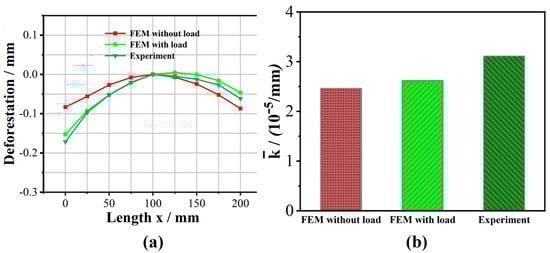 where C represents the center line length and its definition domain is [0, 204], k is the local curvature, ds is the element of arc length, and L is the total length of the center line. Figure 12 shows a comparison between the simulation and the experimental results of the center line mean curvature. From Figure 12, it can be seen that the deformation prediction result of the combined consideration of the workblank initial residual stress and the force load was closer to the experimental result. The simulation results of the mean curvature of with and without force load were 2.62 × 10−5/mm and 2.46 × 10−5/mm, respectively, and the experimental mean curvature of was 3.11 × 10−5/mm. Therefore, the deformation prediction accuracy can be improved by 6.7% when the milling force load is considered.
