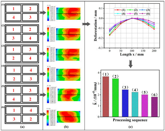 According to Figure 13c, the FPSs had significant effect on the milling deformation. The deformation with FPS (1) and (2) was evidently greater than those with the other FPSs, and the mean curvatures in both cases were 3.66 × 10−5/mm and 3.47 × 10−5/mm, respectively. The deformation with FPS (3) and (4) was in the middle, and the mean curvatures were 2.57 × 10−5/mm and 2.24 × 10−5/mm, respectively. It had the smallest deformation with FPS (5) and (6), the mean curvatures in these two cases were 2.02 × 10−5/mm and 1.81 × 10−5/mm. This result shows that smaller machining deformation can be obtained by using the FPSs of prioritizing the width direction and symmetrical milling. This is due to the fact that asymmetric milling leads to uneven release of the initial residual stresses, which results in increasing deformation. In addition, the short side of the frame-type part has higher rigidity than the long side, and the workpiece is more resistant to deformation caused by stress release when the symmetrical milling along the width is performed first.