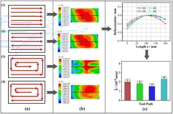 Influence of tool path on the milling deformation: (a) tool path; (b) deformation cloud maps; (c) deformation curves and mean curvatures.