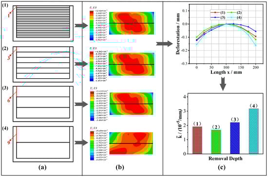 Figure 15 shows the effect of the SFORD on the milling deformation. The so-called SFORD refers to the depth of continuous machining for a single frame when the milling parameters, the FPS, and the tool path remain unchanged. As shown in Figure 15a, four SFORDs of 1 mm, 3 mm, 6 mm, and 9 mm were selected. The milling parameters and the FPS remain unchanged. Figure 15b shows the deformation cloud maps of the bottom of the parts, and Figure 15c shows the comparison of deformation curves and mean curvatures.