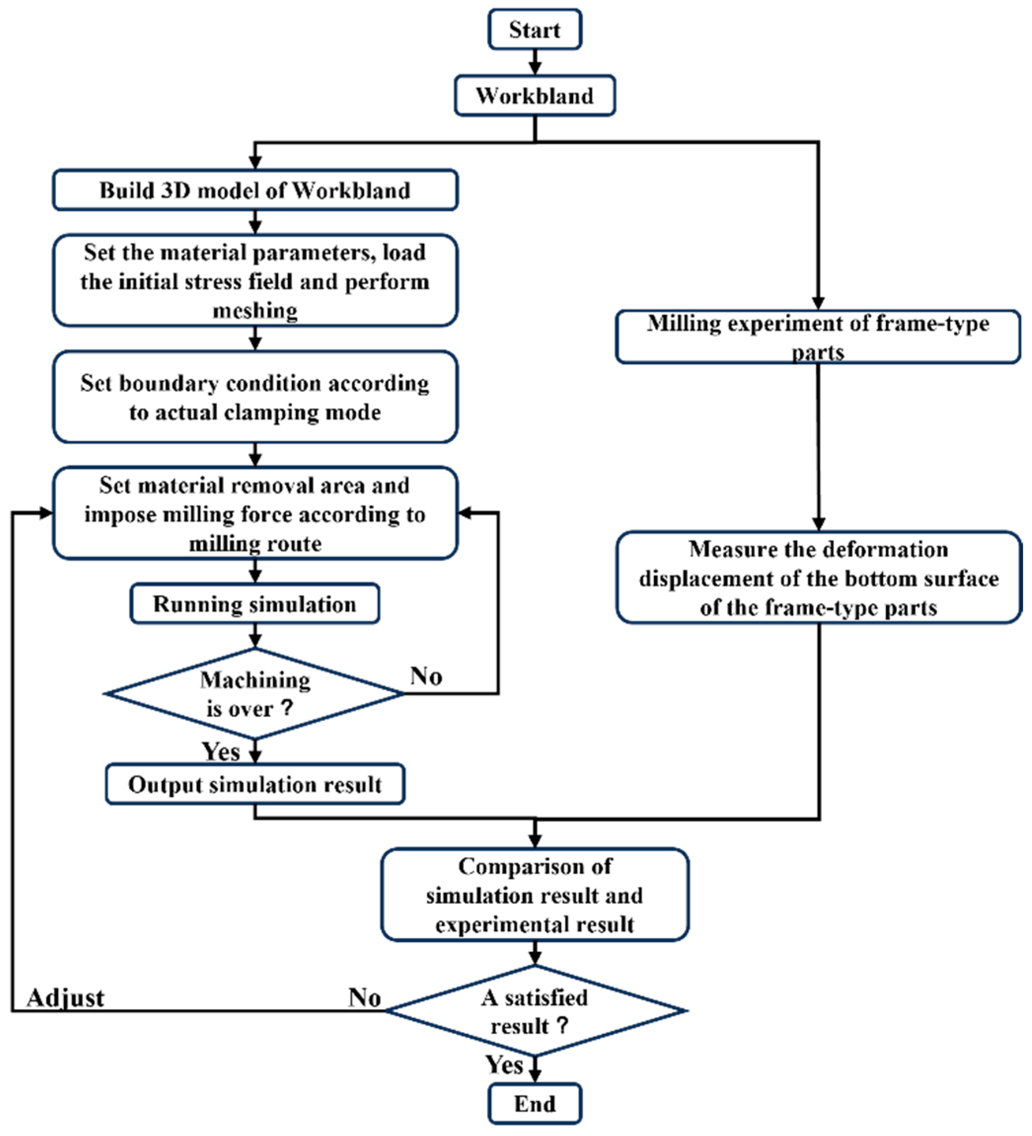 In this research, a four-frame thin-walled part was selected as the analysis object, and the “element deletion method” in finite element simulation was used to simulate the milling deformation. Figure 5 shows the flow chart of finite element simulation for milling deformation. Firstly, a three-dimensional model of the workblank was established by the finite element software ABAQUS, then the material properties were set, and the initial residual stress field was loaded. Secondly, the constraints were imposed on the workblank model according to the actual clamping mode. Thirdly, the milling force was loaded on the workpiece model. Lastly, the prediction of the machining deformation was conducted, and the experimental validation for the predicted resulted was carried out.
