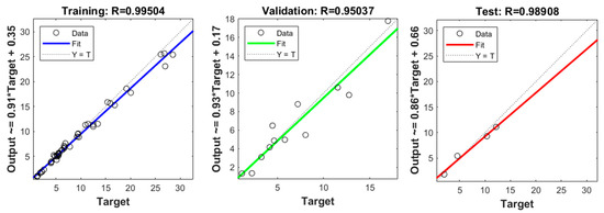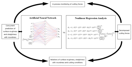 - Determine the feed-forward backpropagation neural network system for the average surface roughness (Ra), the surface roughness (Rz), the straightness (St), and the roundness (Ro) with the ratios of decomposed cutting forces under major cutting conditions to obtain the highest prediction accuracy or correlation coefficient (R).