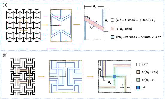 Configurations of the re-entrant (RE) and missing rib square grid (MRSG) structures are shown in Figure 1a,b. The RE specimens were designed with 5 × 3 unit cells and MRSG specimens were 2 × 3 unit cells. The geometric parameters of the RE structure are as follows: H1, B1, t, and θ are the length of half vertical struts, the width of inclined struts, the wall thickness, and the initial inclination angle, respectively. In this study, the angle of θ was kept constant as 30°, and H1 was designed to be equal to the length of the inclined strut; thus, the ratio of B1/H1 is also a constant, denoted as k1. The structure parameters of the MRSG unit cell are marked as follows: H2, B2, and t are the length of half vertical ribs, the length of half horizontal ribs, and the wall thickness. The ratio of H2/B2 is denoted as k2, which is designed as a constant of 1.5. The selection of k1 and k2 ensures relatively uniform material distribution, preventing premature strut contact during deformation, thereby reducing the chances of premature structural failure. The thickness of the lattice walls of RE structures was designed to be the same as that of MRSG structures, which was set as 1.52 mm, three times the nozzle diameter of the FDM machine. Based on the above geometry parameters, the relative density formulas of the RE and MRSG lattices can be expressed as Equations (1) and (2):