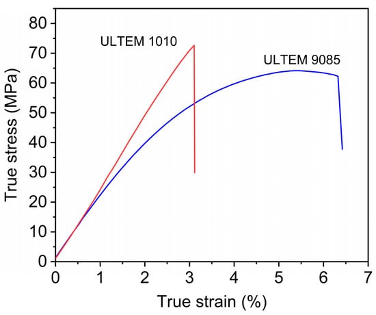 The true strain–stress curves of ULTEM 9085 and 1010 FDM tensile coupons.
