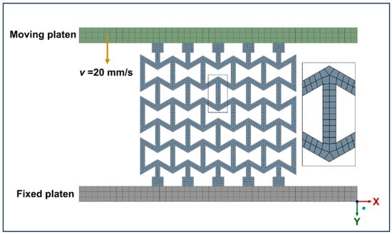 Finite element (FE) models were developed using ANSYS/LS-DYNA to simulate the behavior of RE and MRSG specimens under quasi-static uniaxial compression. A typical model is illustrated in Figure 3. The geometries of the RE and MRSG structures, along with two platens positioned at the top and bottom, were imported into the FE software. The material of the platens was structural steel, while the auxetic structure was made of ULTEM 9085 or 1010. An elastic–plastic multilinear isotropic hardening material model, based on the uniaxial tensile test data, was adopted. The basic material properties used are shown in Table 2. The element size of the XY face of the auxetic structures was set to 0.76 mm, which is half of the wall thickness. The contact type between the platens and the auxetic samples was defined as frictional, with a friction coefficient of 0.3. A body interaction was introduced to prevent self-penetration of the structures. The bottom platen was completely fixed, and a uniaxial velocity of 20 mm/s was applied to the upper platen in the Y direction.