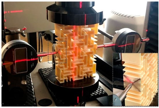 Uniaxial quasi-static compressive tests were conducted using an MTS Criterion 43 machine equipped with a 50 kN load cell at a constant speed of 0.5 mm/s. The samples were compressed to densification along the Y direction, and the displacement and force data in the Y direction were recorded by the machine. To calculate Poisson’s ratio, the lateral displacement was measured using two digital indicators rigidly fixed on tripods, as shown in Figure 4. The indenter of each digital indicator was in close contact with the specimen’s side surface using a specialized tip, and a laser level meter was employed to ensure proper alignment of the digital indicator bars.