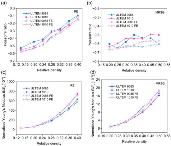 The Poisson’s ratios of RE and MRSG auxetic structures fabricated from ULTEM 9085 and ULTEM 1010 were determined by plotting the relative longitudinal strain against the relative transverse strain, performing linear fitting, and taking the negative slopes as the Poisson’s ratio. The simulated Poisson’s ratio was obtained by adding probes at the midpoint of the model’s sides (the same position as the digital indicators) to record the longitudinal and transverse displacements. The experimental and simulated results of the Poisson’s ratios for RE and MRSG structures of different materials against their relative densities are shown in Figure 5a,b. The equivalent Young’s moduli during the elastic deformation stage were also studied, as shown in Figure 5c,d.