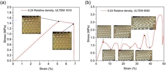 During the compression process of the samples, the deformation videos were recorded using a camera and analyzed in conjunction with the stress–strain curves. Figure 6a,b show the stress–strain curves and deformation photos at typical points for RE structures with a relative density of 0.24, prepared from different ULTEM materials.