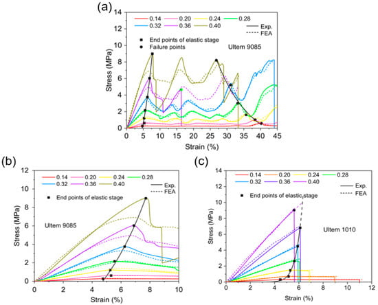 Figure 7a,c present the experimental and simulated stress–strain curves of ULTEM 1010 and ULTEM 9085 RE structures under uniaxial compressive loading at various relative densities. Figure 7b exhibits the elastic stage curves of ULTEM 9085 RE structures.
