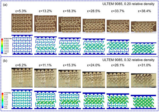 The experimental and simulated deformation behavior of RE structures with ULTEM 9085 material: (a) 0.20 relative density; (b) 0.32 relative density.