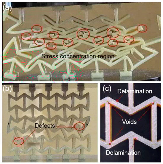 Figure 9a shows a photo of a ULTEM 9085 structure after densification and damage. Figure 9b shows the case of a 0.36 relative density ULTEM 9085 RE structure, which had defects embedded in the intersection area during the additive manufacturing process. This phenomenon can be more clearly observed in Figure 9c. During the printing process of the RE structures, the re-entrant intersection serves as discontinuity points in material deposition, where incomplete material filling frequently occurs, leading to the formation of void defects. In addition to void defects, inadequate bonding between adjacent deposition contours may also result in delamination defects.