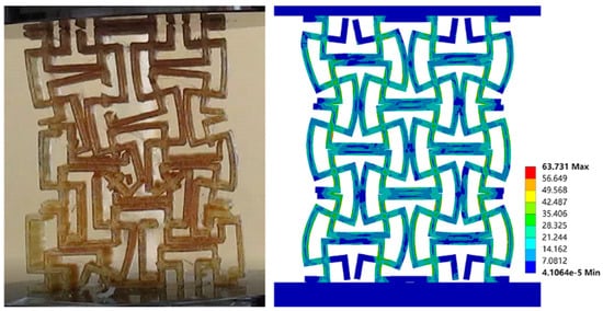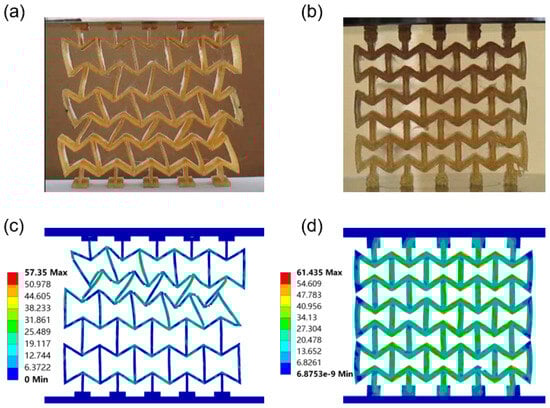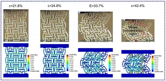 Figure 13 exhibits that, during the elastic deformation phase, the primary deformation of the structure was primarily due to the bending of the longitudinal struts, which exhibited higher stress compared to the transverse struts, as seen in the stress contour image. The bending of the longitudinal struts caused the central parts of the square grids to rotate, resulting in a contraction in the transverse direction, thereby demonstrating a negative Poisson’s ratio effect. As the longitudinal deformation progressed, the middle row of the MRSG structure was extruded. During this process, stress concentrations formed at the central part of the square grids and the densified regions of the upper and bottom rows, resembling a “>” shape. The deformation photos showed that the damage mostly occurred in these stress concentration regions. Figure 14 shows that stress concentrated at the cross-centers and the longitudinal struts of the ULTEM 1010 structure, and the experimental photos showed that most of the damage also occurred in these locations, so the simulation and experimental results were found to be in good agreement.