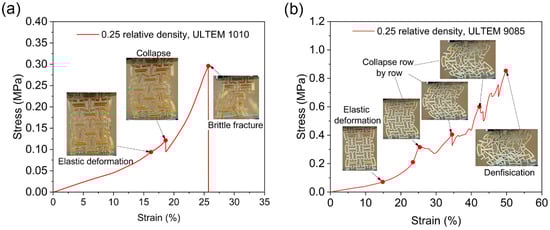 The deformation behavior of RE structures with (a) ULTEM 1010; (b) ULTEM 9085 at 0.24 relative density.