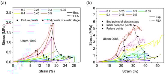 Experimental and FEA strain–stress curves of MRSG structures with (a) ULTEM 1010; (b) ULTEM 9085 material.