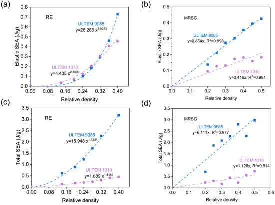 By integrating the force–displacement curves of auxetic structures, their energy absorption performance can be determined. As shown in Figure 15, the area under the curve during the elastic deformation stage represents the elastic energy absorption, while the area under the curve before densification or failure represents the total energy absorption. The specific energy absorption (SEA) was calculated by dividing the energy by the mass of the auxetic structure. Figure 16a–d show the SEA results of RE and MRSG structures with different materials.