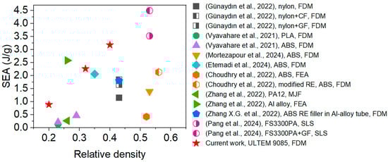 It can be observed from Figure 17 that the ULTEM 9085 structures in the current study are located in the upper left region of the graph, indicating a high SEA performance at lower relative densities and a superior SEA performance compared to polymeric material structures from other studies.