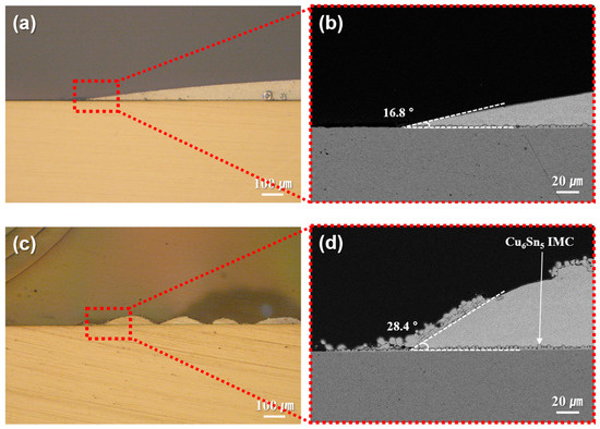 Figure 2c,d) exhibited signs of lower reducibility, including the presence of non-wet particles and an increased wetting angle (28.4°) at the formed solder caps. Nevertheless, EW-10 demonstrated sufficient reducing capability to activate both the SAC305 powder and the Cu surface, leading to wetting of the SAC305 particles on the Cu substrate. As a result, the formation of a Cu