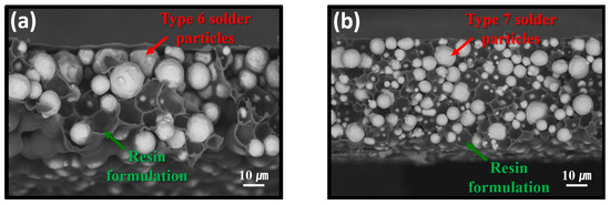 Figure 3b), consistent with their nominal size ranges of approximately 5–15 μm for type 6 and 2–11 μm for type 7. The average particle size difference between the two types was approximately 2.5-fold. Owing to the stencil printing process used for fabrication, both the type 6- and type 7-based sheets exhibited a uniform thickness of approximately 100 µm. Additionally, the resin formulation uniformly surrounded the SAC305 particles, forming a consistent matrix structure in both sheets.