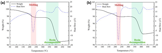 Figure 4b). Both sheets exhibited similar thermal behavior. The first endothermic peaks, observed at 225.7 °C in