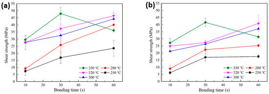 Figure 5a presents the shear strength values of solder joints formed using the sheet with type 6 SAC305 powder, bonded in air at temperatures ranging from 250 to 350 °C, as a function of bonding time. At 250 °C, the shear strength started at a relatively low value of 7.3 MPa for a bonding time of 10 s and increased to 23.5 MPa at 60 s. However, significant amounts of PMMA remained in the joint, indicating that the polymer was not fully decomposed and removed during bonding. When the bonding temperature was increased to 280 °C, the shear strength was still low at 9.1 MPa for 10 s but increased to 25.8 MPa at 30 s and reached 40.1 MPa at 60 s, showing a substantial improvement. At 300 °C, even a short bonding time of 10 s resulted in a shear strength of 27.7 MPa, which further increased to 44.3 MPa at 60 s. A similar trend was observed at 320 °C. However, at 350 °C, the shear strength increased from 29.6 MPa at 10 s to a maximum of 48.0 MPa at 30 s, but then significantly decreased to 36.1 MPa at 60 s. This reduction suggests that prolonged exposure to excessively high temperatures may degrade the joint integrity or introduce defects.