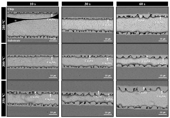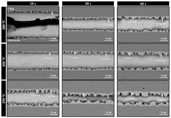 Figure 7. At 280 °C, minimal thermal decomposition of PMMA was observed at a bonding time of 10 s, resulting in significant PMMA residue and poor solder interconnection. However, by 30 s, the amount of residual PMMA was significantly reduced, and by 60 s, solder interconnections were formed across most regions of the joint. According to SEM images, only Cu