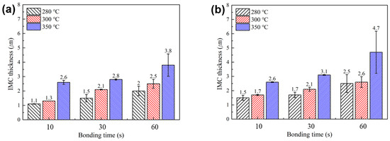 Figure 8 summarizes average thickness of interfacial IMC layers formed at the upper and lower bond-line interfaces under various bonding temperatures and times, as observed in