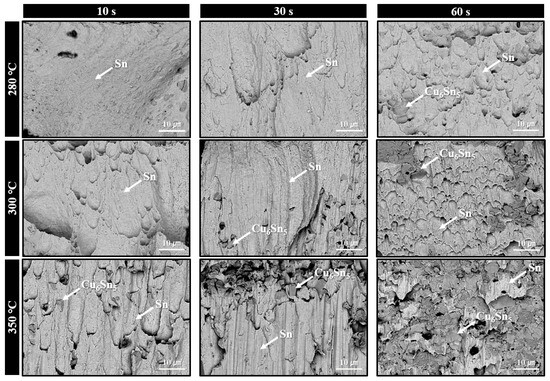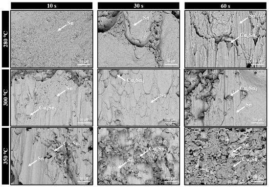 Figure 9, and subjected to shear testing at various bonding times. At 280 °C and 10 s bonding time, insufficient solder interconnection resulted in a lack of observable deformation or tearing of the solder along the shear direction. However, as the bonding time increased to 30 s and 60 s, elongated and torn solder fracture features gradually developed. For the samples bonded at 300 °C, elongated surfaces were already evident at 10 s and became more pronounced at 30 s. At 60 s, rougher regions appeared locally on the fracture surface, accompanied by visible Cu