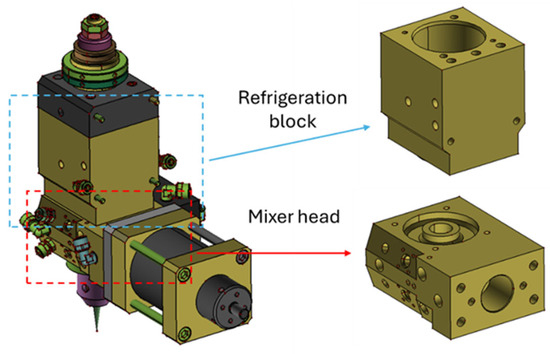 The original geometry is part of a robotic arm that is used to mix two liquid components, i.e., isocyanate and polyol, to produce a polyurethane foam for thermal covers and other applications. This study is a continuation of an innovative design [20] of two parts of the assembly shown in Figure 1, which are the mixer head and the refrigeration block.