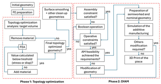 To make the best use of the topology optimization analysis for additive manufacturing during this study, a workflow has been defined in order to ensure that an efficient approach is followed and that the technology is compatible with the design obtained, as presented in Figure 3. Therefore, two main phases are defined: (a) the design phase with the definition of the geometry for the topology optimization; (b) the DfAM phase, where the understanding of the technology, in this case the AM powder bed fusion, is required.