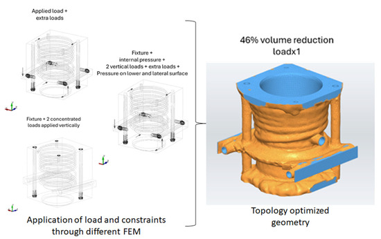Therefore, the FE should have the geometry loaded in its working conditions plus an additional load representing the surfaces that are not intended to be eliminated, such as the hole for the screws or other surfaces to maintain parts that are not loaded (i.e.,: definition of the design and non-design volumes). Once the FEM is ready, the optimization can be performed with ProTOp, and several attempts should be made in order to find out a geometry more suitable for the current study.